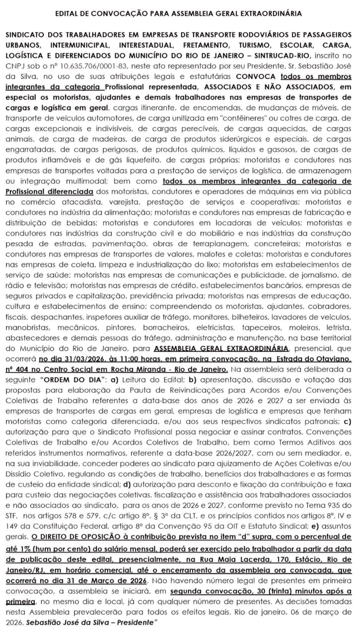 Edital de Convocação para Assembleia de Aprovação de Pautas 2026/2027 – CARGA, LOGÍSTICA e DIFERENCIADOS